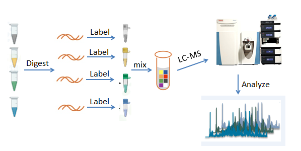 iTRAQ(isobaric tags for relative and absolute quantification)和TMT(Tandem Mass Tags)同位素标記定量技術是分别由SCIEX公司和Thermo公司研發(fā)的一種(zhǒng)體外同種(zhǒng)同位素标記的相對(duì)與絕對(duì)定量技術。該技術利用多種(zhǒng)同位素試劑标記蛋白多肽多肽的氨基基團,經(jīng)高精度質譜串聯分析,可同時(shí)比較多達8-16種(zhǒng)樣品之間的蛋白表達量。